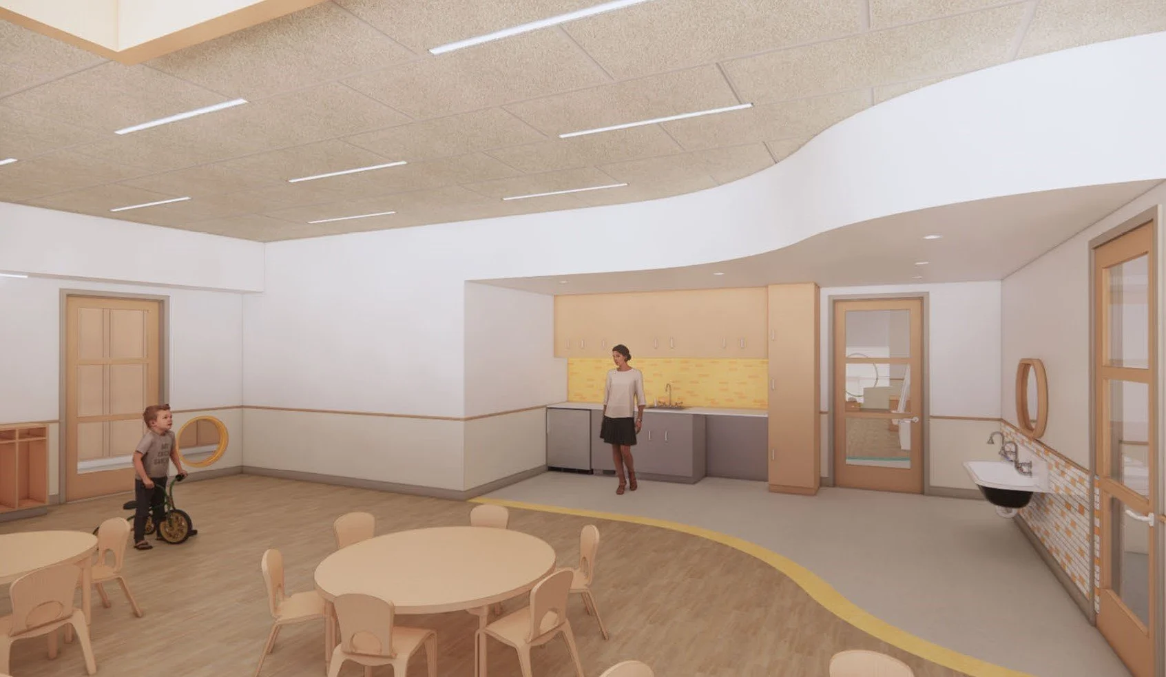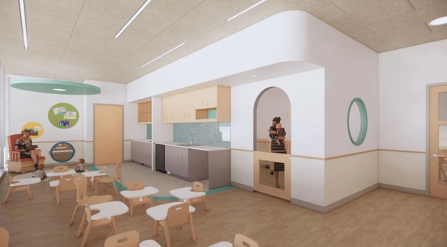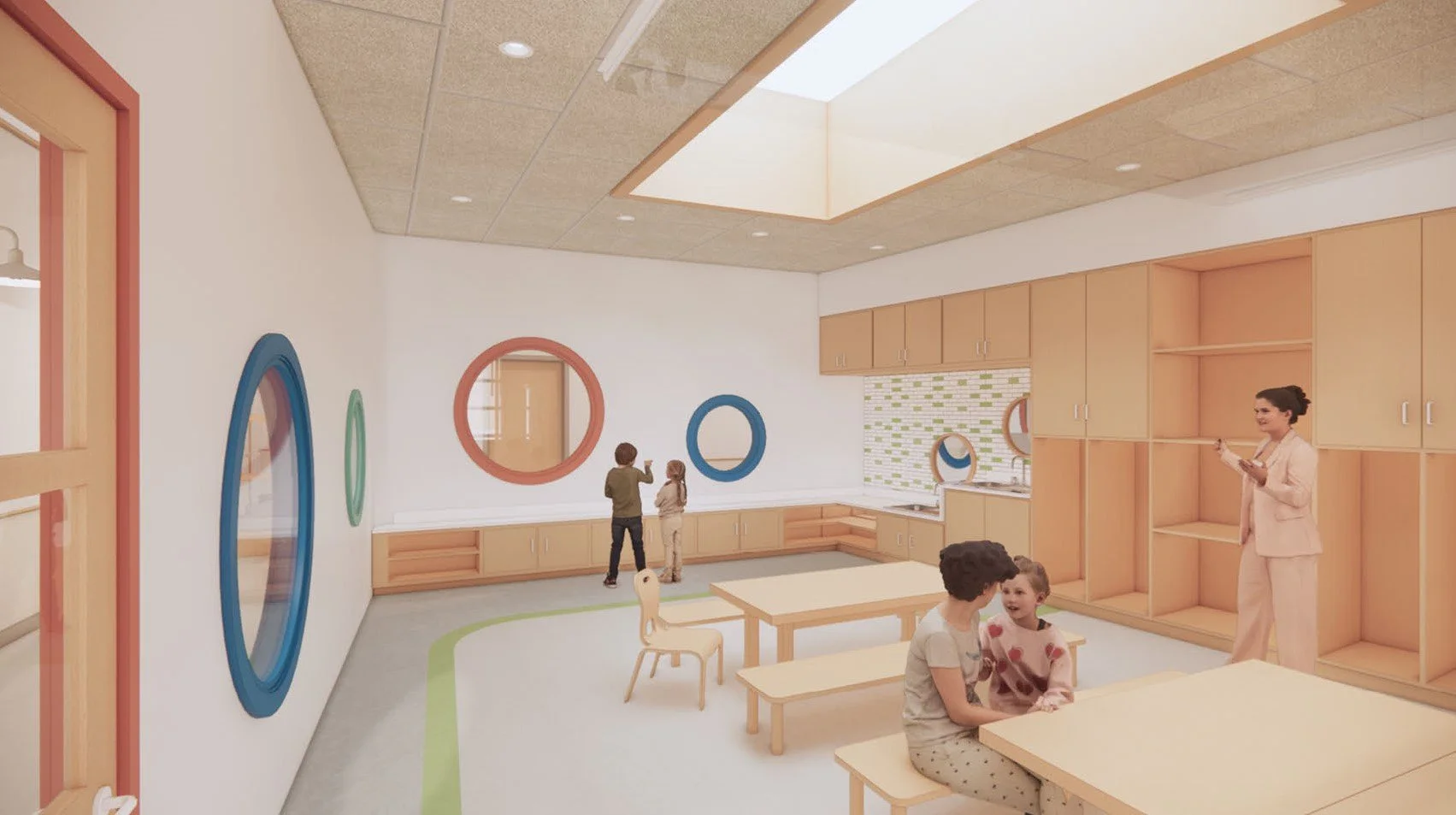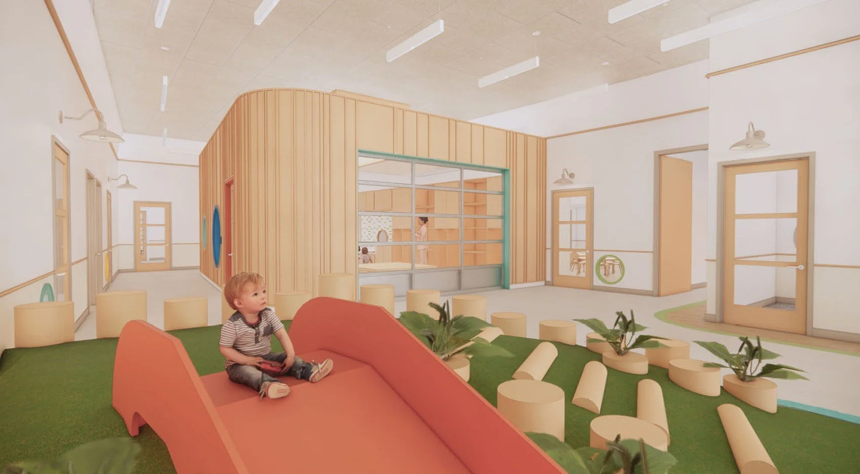 Our design responded by organizing six classrooms around a central interior courtyard, which functions as a dynamic gross motor space. At its heart, a standalone STEAM lab opens directly to the courtyard, encouraging exploration and interdisciplinary learning. Administrative offices and back-of-house functions are strategically placed toward the rear of the space for operational efficiency.