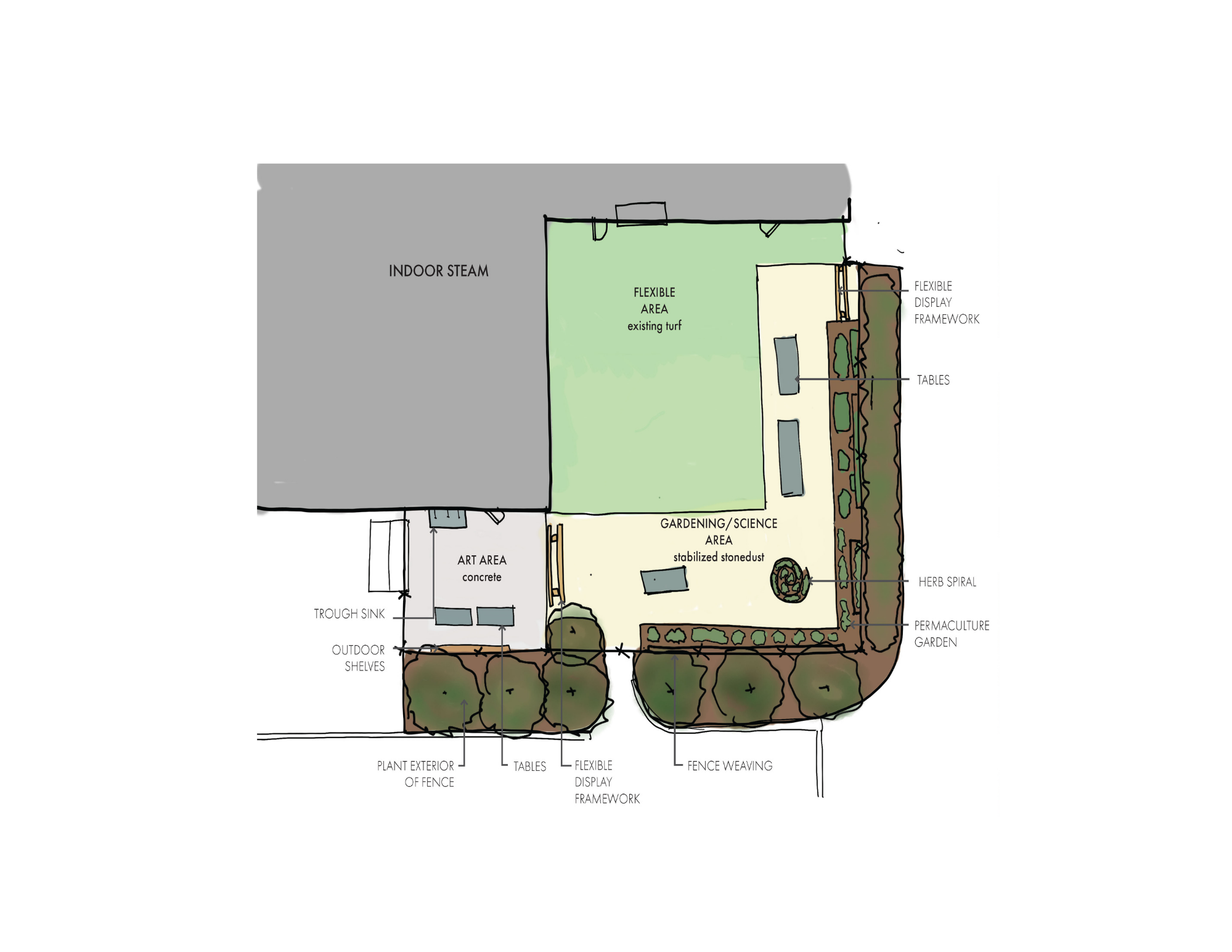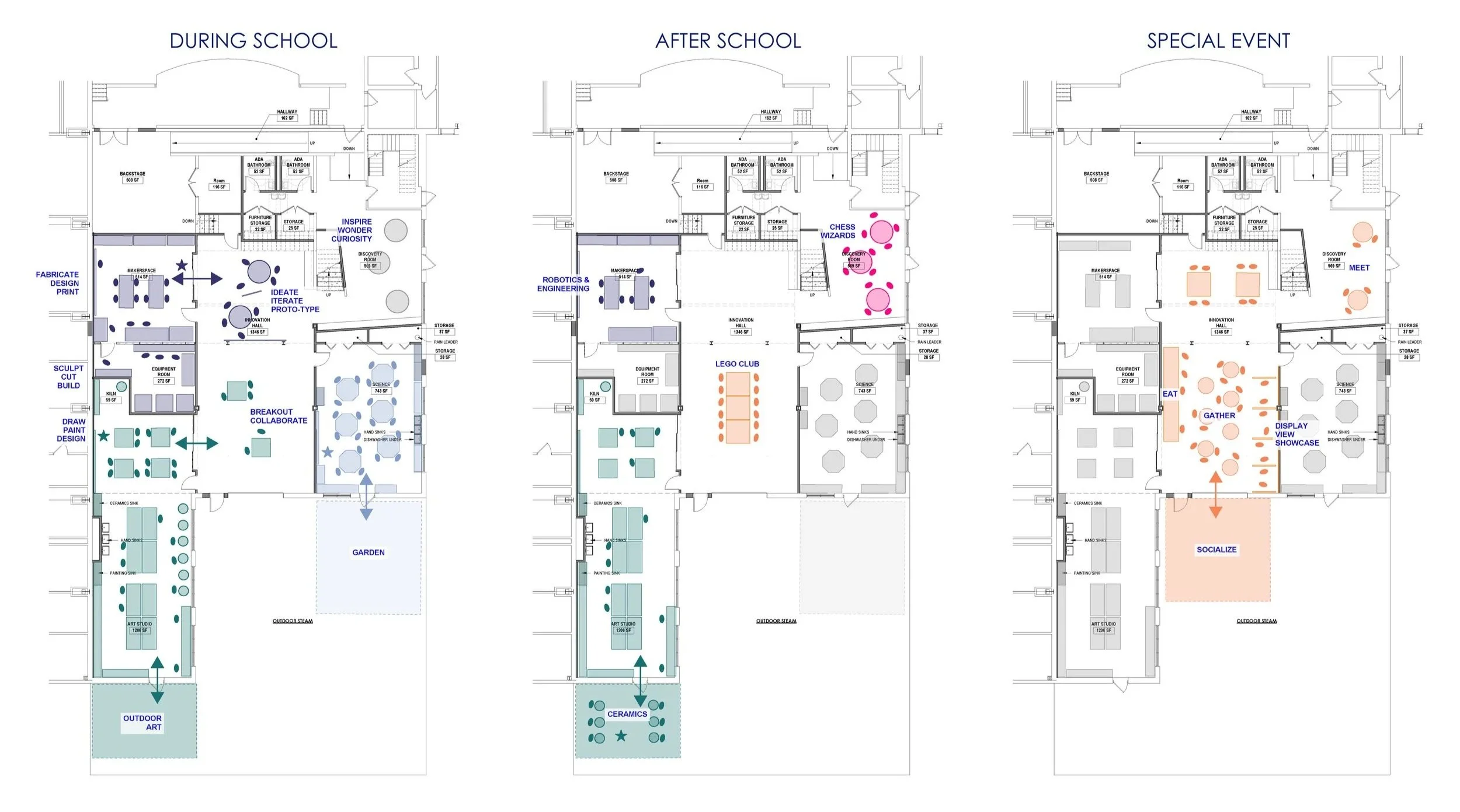 Relocating the existing STEAM programs across the upper school (3rd thru 8th grade) into one hub. The new STEAM Center is organized around a central Innovation Hall—an adaptable canvas for inquiry, exhibition, and community. Surrounding hubs include a makerspace/wood shop lab, science labs, art and ceramics studio with kiln storage, a digital media lab/recording space, and theater support areas. Operable glazed walls and flexible furniture allow for rapid prototyping, small group learning, and cross-discipline teaching. A large garage door opens Innovation Hall directly into an outdoor STEAM courtyard and academic garden, extending learning beyond the classroom. This project is estimating completion Summer 2026.