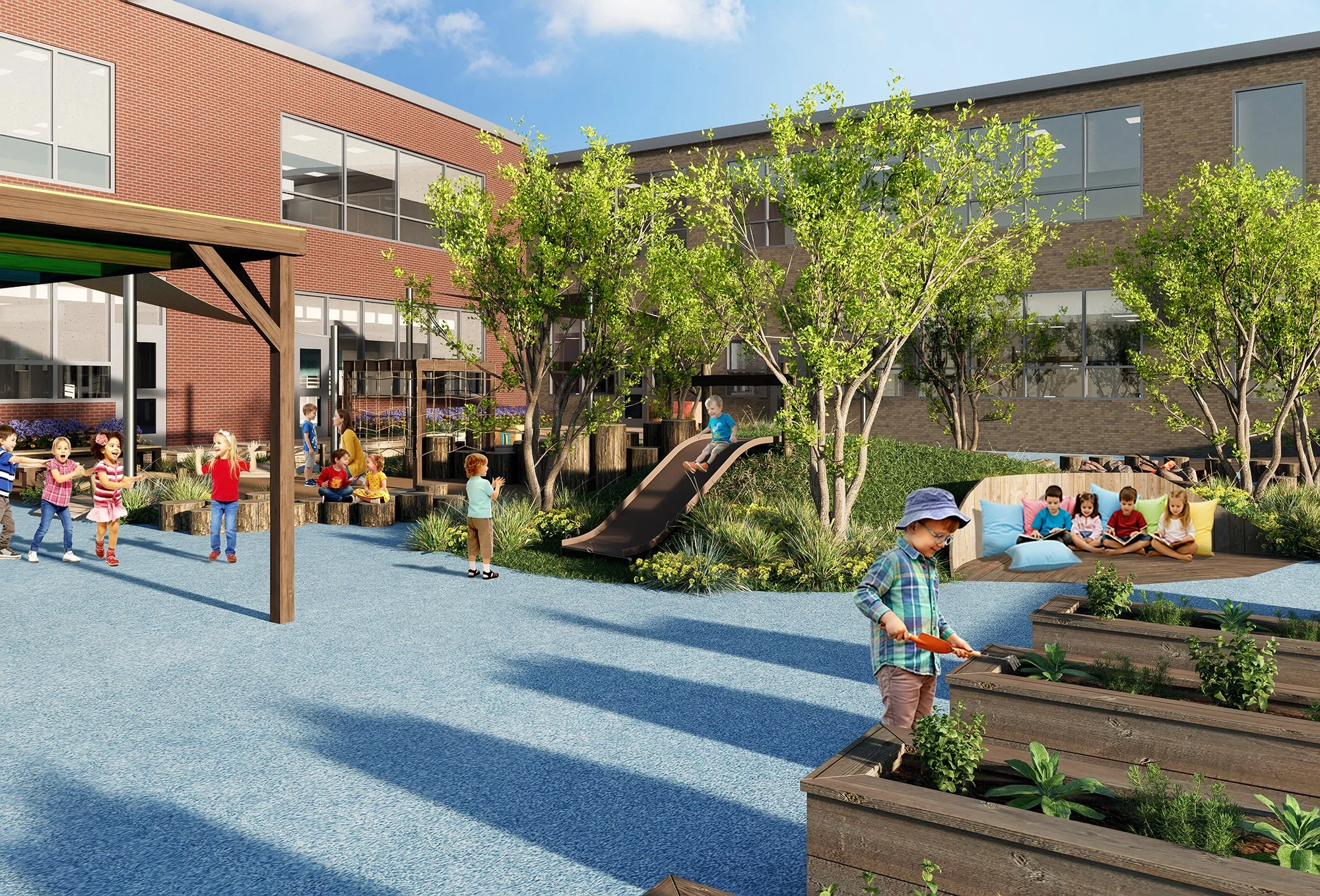 Renovating the ground floor of the lower school to support their early education center and expanding enrollment, relocated from the upper school. The early education center serves infants through pre-k and includes 14 classrooms, early education community room, renovated administrative spaces, toddler playground and preschool/pre-k playground. This project is estimating completion Summer 2026.
