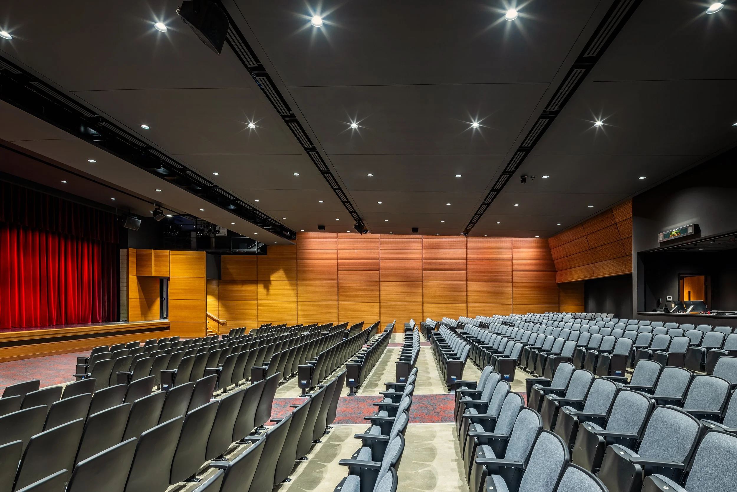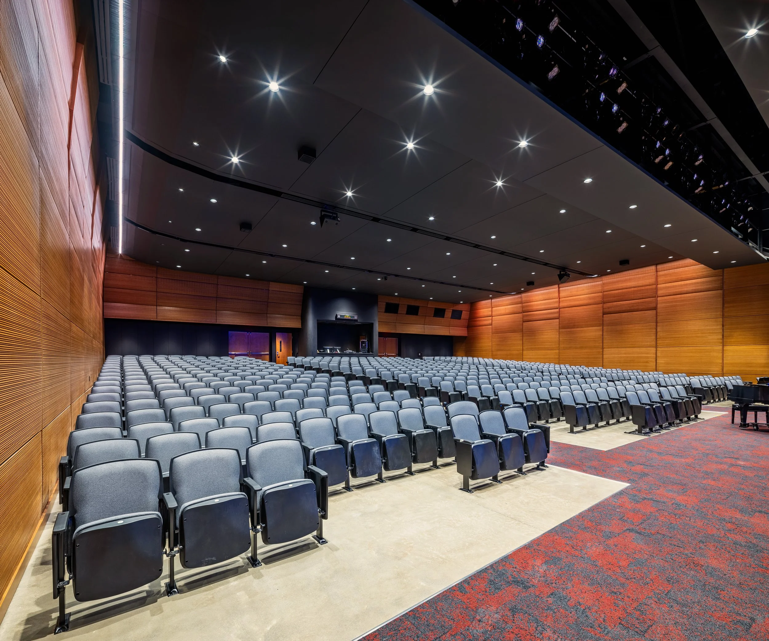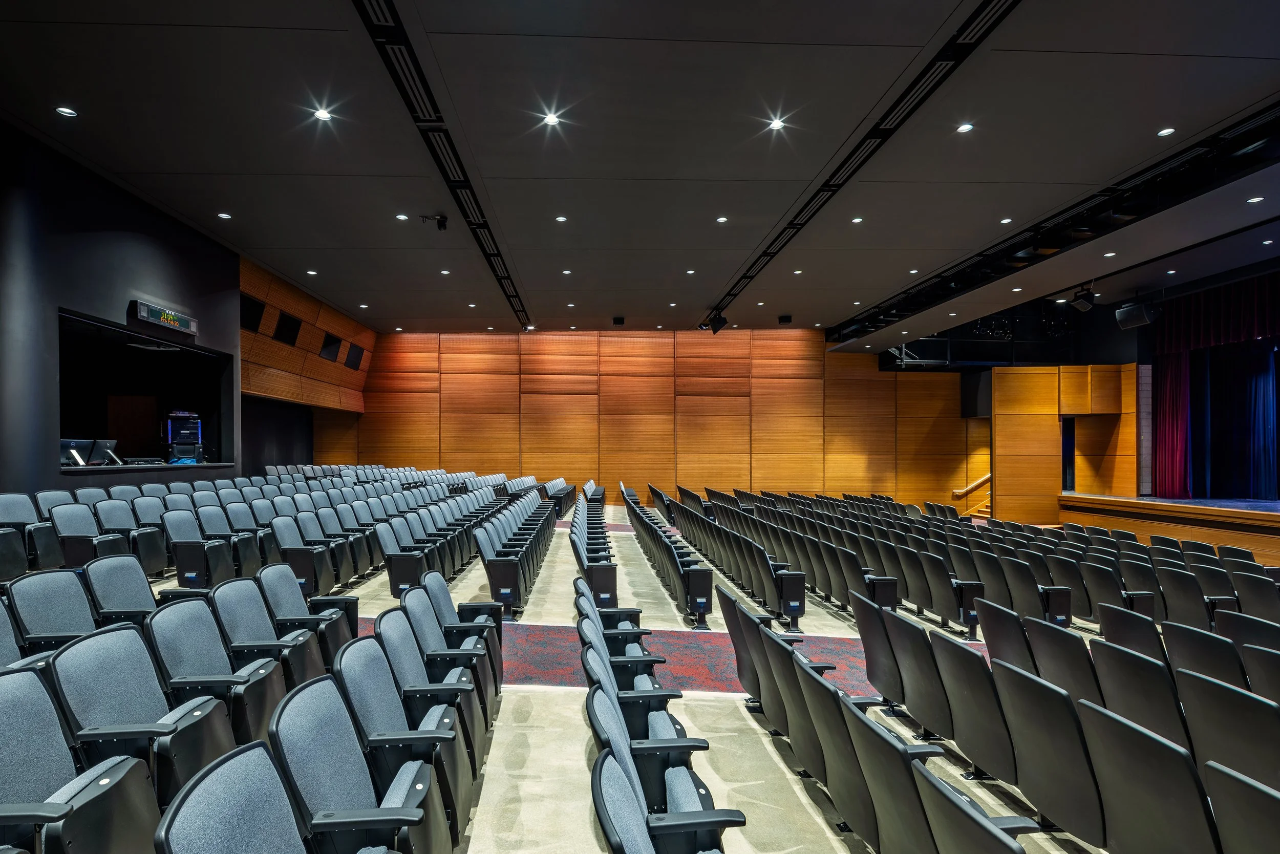 A brand-new catwalk system was installed closer to the stage, allowing for better control of the new state-of-the-art lighting system and integrated sound system. Acoustic upgrades mitigated the sound issues the district was experiencing from the adjacent mechanical room, leading to a better experience for both the audience and performers. Brand new seating and an improved layout allowed for an expansion of seats as well as a variety of seating types to accommodate all guests to enjoy the space for years to come.